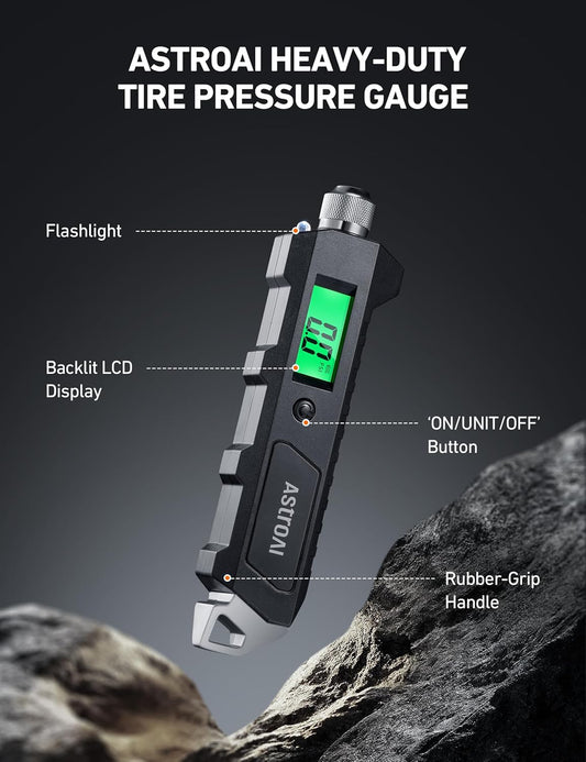 Digital Tire Pressure Gauge, 230 PSI 4 Settings Heavy Duty for Car Bicycle with Larger Backlit LCD Flashlight and Non-Slip, Black